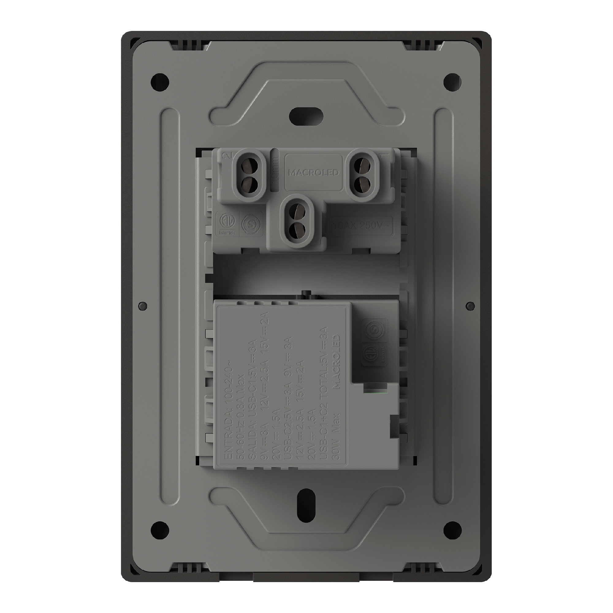 TECLA Y USB-C MILAN GRIS MACROLED, 1 CANAL, 2 VIAS, AC 250V, 10A MAX. 2 USB-C DE 30W, BASTIDOR METALICO