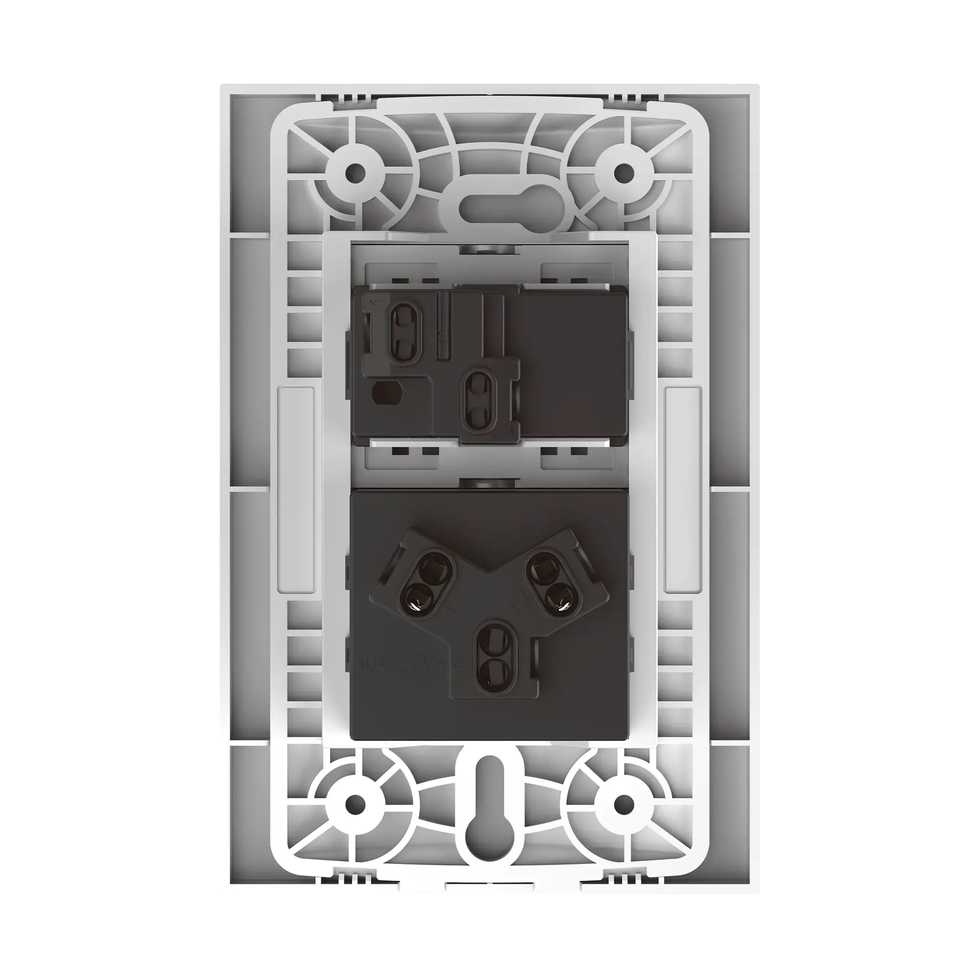 INTERRUPTOR 1 CANAL, 1 VIA, TAMAÑO 1.5 MODULOS + TOMACORRIENTE SIMPLE BI-NORMA, VERTICAL, TAMAÑO 1.5 MODULOS