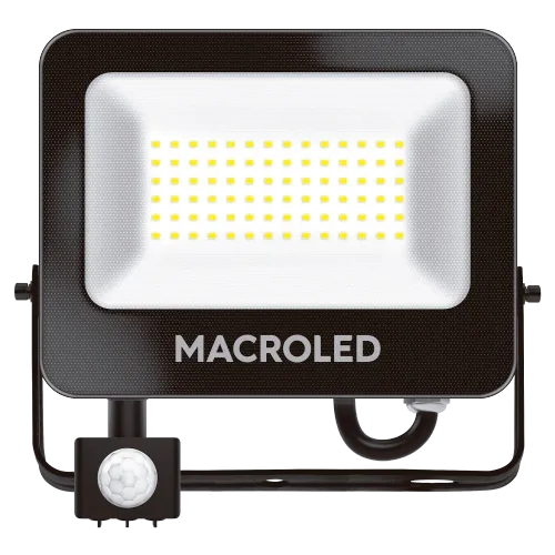 REFLECTOR LED CON SENSOR DE MOVIMIENTO MACROLED, AC160-265V, 50W, 6500K,FP 0.9, 110lm/W, CRI 80, BRAZO 45°